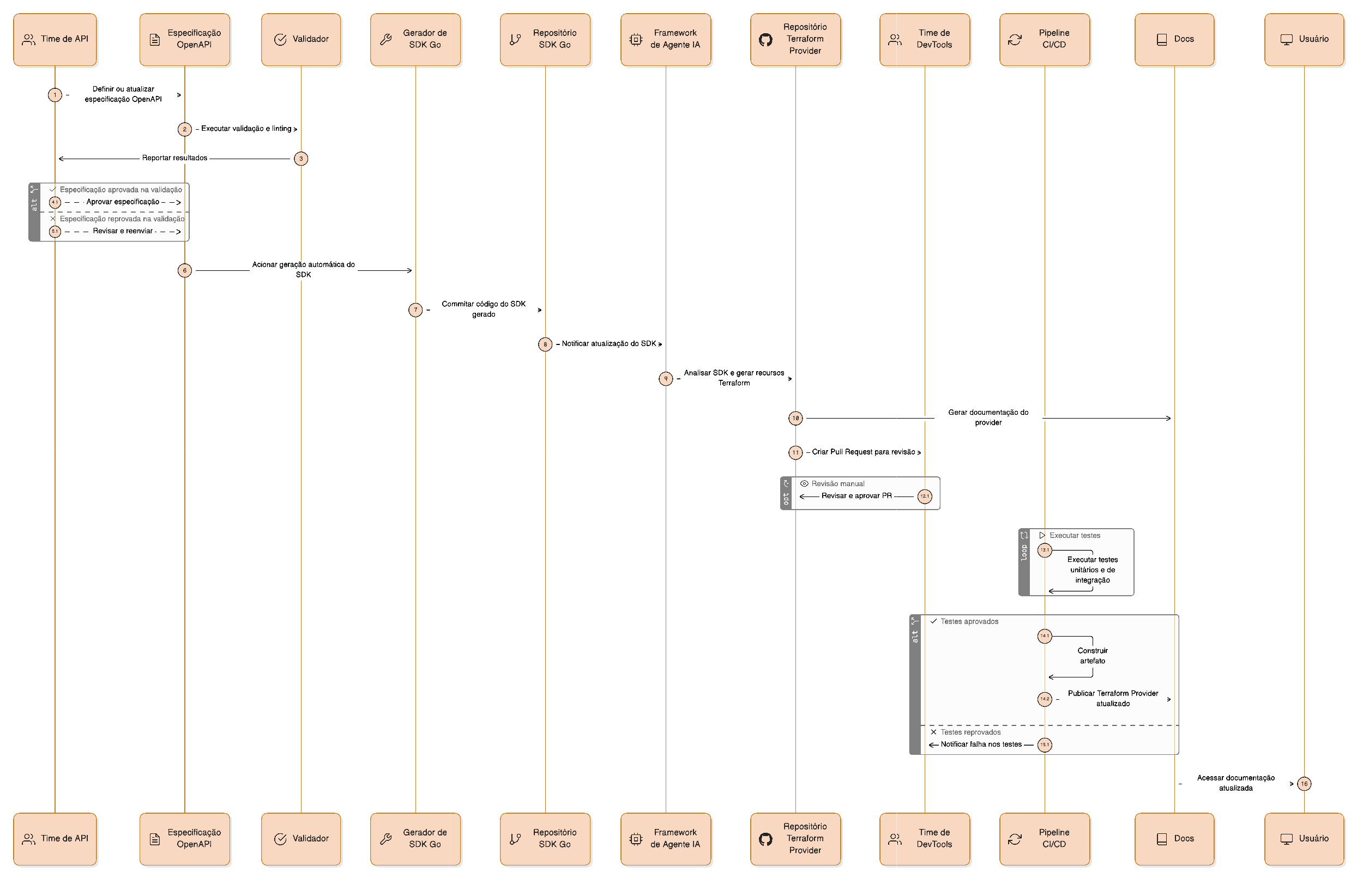 A inovação mais significativa desta versão é como o provider é construído. Para resolver o problema histórico do “provider lag”, onde ferramentas de IaC ficam para trás das atualizações de API, implementamos um pipeline sofisticado e automatizado, impulsionado por AI e SDKs autogerados.